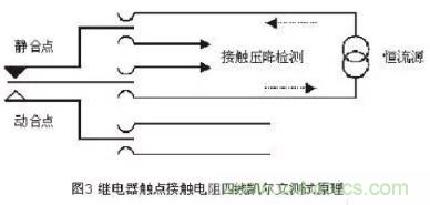触点接触电阻包括动合点接触电阻和静合点接触电阻,是继电器最重要的参数之一,也是最难测的参数的之一。图3显示了对继电器触点进行四线凯尔文测试的原理。说其难测是因为接触电阻只有几十毫欧、十几毫欧,甚至只有几毫欧,如果不是全线采取四线凯尔文测试,扣除测试系统的内部电阻和接触电阻则很难将其测准。说其重要是因为触点接触电阻除了反映触点的电性能(电阻)以外,还反映了触点的化学和物理性能,例如触点表面是否有钝化膜产生,触点间的压力是否能达到设计要求。试验证明当继电器中的弹性材料应力减退,触点压力下降将会在触点接触电阻参数上有明显的反映,所以触点接触电阻与继电器的接触可靠性密切相关。表2显示了继电器样品在试验中触点接触电阻和触点压力之间的关系。