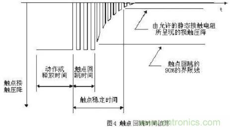 回跳时间包括吸合回跳时间和释放回跳时间。由于继电器是采用有弹性的机械触点完成线路的接通和断开,因此不同于由半导体器件组成的无触点电子开关,当继电器的触点接通或断开的瞬间会有一段不稳定的接触期,典型的触点波形见图4。