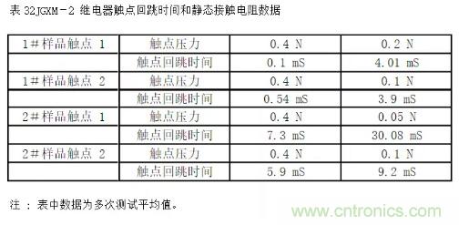 MIL-R-39016D和GJB 65A-91对触点回跳做了定义:“等于或大于开路电压的 90%,且脉冲宽度等于或大于 10 uS 的现象则认为是回跳”。同时明确规定触点回跳时间不得超过 1.5 mS。有些用户对回跳时间参数不以为然,认为触点最终总会接通(或断开),过程中有没有回跳不影响继电器的正常使用。这是一种错误的认识,军标之所以规定回跳时间参数的测试,是因为继电器的回跳时间同静态接触电阻参数一样,反映了继电器的触点压力,试验证明,当继电器的触点压力明显衰退时,回跳时间会变长。表3显示了继电器样品在试验中触点回跳时间和触点压力之间的关系。