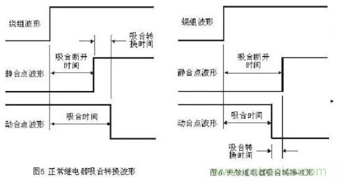 转换时间包括吸合转换时间和释放转换时间。以吸合转换时间为例,继电器在吸合过程中,静合点断开时间与动合点吸合时间之差称为吸合转换时间。图5和图6分别显示了合格继电器和失效继电器的吸合转换波形。