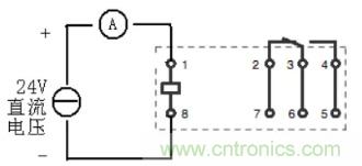 b、额定电流测试:对继电器1、8脚供直流24V电,等30秒读取电流表数据 注意:电流测试,万用表表笔插至电流输入端口,并调整电流档对应的量程档位(mA)。
