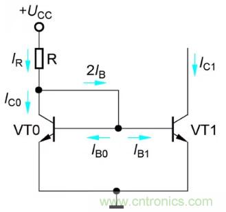如图1所示为镜像恒流源电路,它由两只特性完全相同的管子VT0和VT1构成,由于VT0管的c、b极连接,因此UCE0=UBE0,即VT0处于放大状态,集电极电流IC0=β0*IB0。另外,管子VT0和VT1的b-e分别连接,所以它们的基极电流IB0=IB1=IB。设电流放大系数β0=β1=β,则两管集电极电流IC0=IC1=IC=β*IB。可见,由于电路的这种特殊接法,使两管集电极IC1和IC0呈镜像关系,故称此电路为镜像恒流源(IR为基准电流,IC1为输出电流)。