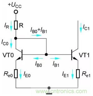 如图2所示为比例恒流源电路,它由两只特性完全相同的管子VT0和VT1构成,两管的发射极分别串入电阻Re0和Re1。比例恒流电路源改变了IC1≈IR的关系,使IC1与IR呈比例关系,从而克服了镜像恒流源电路的缺点。
