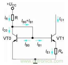 与典型的静态工作点稳定电路一样,Re0和Re1是电流负反馈电阻,因此与镜像恒流源电路相比,比例恒流源的输出电流IC1具有更高的稳定性。