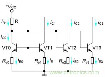 图4所示电路是在比例恒流源基础上得到的多路恒流源电路,IR为基准电流,IC1、IC2和IC3为三路输出电流。由于各管的b-e间电压UBE数值大致相等,因此可得近似关系