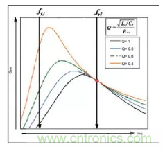如果使用图形表示谐振单元的增益,我们就得到图3所示的曲线,不难看出,图形变化与Q值相关。