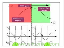 分析一下谐振频率的方程式就会发现,在高于峰值增益频率时,谐振网络的输入阻抗是感抗,谐振网络的输入电流(Ip)滞后于谐振网络的输入电压(Vd)。在低于峰值增益频率时,谐振网络的输入阻抗变为容抗,并且Ip领先Vd。在电容区工作时,体二极管在MOSFET开关期间执行反向恢复操作。