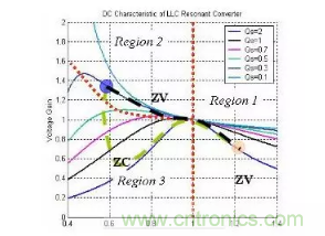 LLC谐振转换器的工作范围受限于峰值增益。值得注意的是,峰值电压增益既不发生在fr1处 ,也不出现在 fr2处。峰值增益对应的峰值增益频率是fr2与fr1之间的最大频率。随着Q值减小(随着负载减?。?,峰值增益频率移向fr2,并且获得更高的峰值增益。随着Q值增加(负载增加),峰值增益频率移向fr1,峰值增益下降。因此,满载应该是谐振网络设计的最差工作条件。