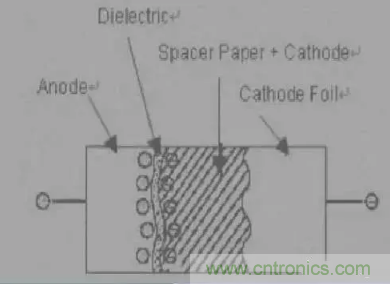 由于电解电容器存在极性,在使用时必须注意正负极的正确接法,否则不仅电容器发挥不了作用,而且漏电流很大,短时间内电容器内部就会发热,破坏氧化膜,随即损坏。 如图为铝电解电容的基本结构,它由阳极( anode )、在绝缘介质上附着的氧化铝构成的铝层,接收极的阴极铝层,和真正的由电解液构成的阴极。电解液浸透在两个铝层间的纸上。 氧化铝层是通过电镀在铝层上,相对于加在其上的电压来说是非常薄的,很容易被击穿,导致电容失效。