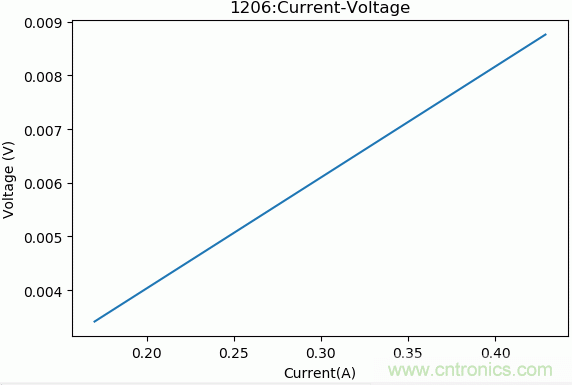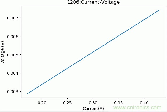 下面分别测试了0603, 0805, 1206三种封装下,通过的电流和电阻两端之间的电压的关系??梢钥吹饺址庾暗牡缱瓒荚诘缌魇导食?A之后,电压开始快速上升。