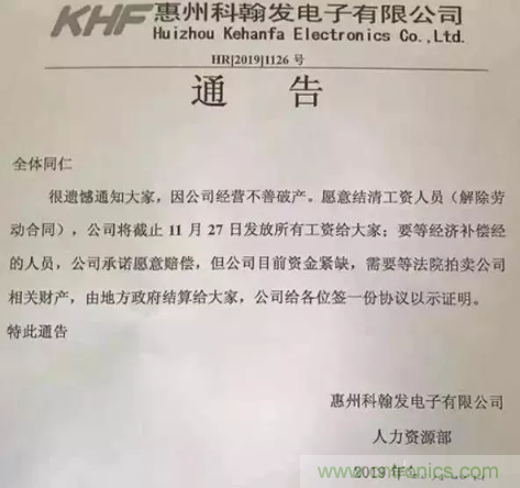 不仅仅是韩国LG因销量下滑关闭PCB业务,就在前几日,PCB厂商惠州科翰发电子发出破产公告。公告称,由于公司经营不善导致破产,和员工解除劳动合同并结清工资,将于11月27日发放薪资给大家,通告中特别说明公司愿意赔偿给需要经济补偿金的人员,只是由于公司资金紧缺,公司会和员工签一份证明协议,待法院拍卖公司财产后由地方政府结算,也算是给员工一个交代。