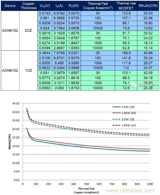 SO8封装的标准热阻为:RJA=90C/W,RJC=12C/W;Ultra SO8封装的标准热阻为:RJA=50C/W,RJC=2.5C/W。这二种封装PCB铜皮尺寸和对应热阻关系如图11所示。