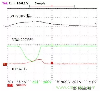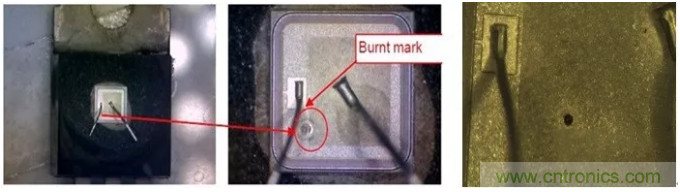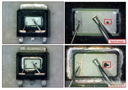 例2:日光灯电子镇流器的PFC电路,系统在动态老化测试过程中,MOSFET产生损坏失效,测试实际的电路,在起动过程中,MOSFET实际驱动电压只有5V左右,MOSFET相当于有很长的一段时间工作在线性区,器件形成局部热点,而且离G极比较近,因此,器件是在开通过程中,由于较长时间工作线性区产生的失效,工作波形和失效形态如图2、图3所示。