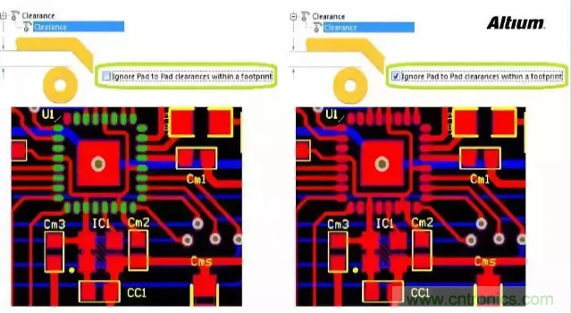 如果整个PCB的最小安全间距设置是8mil,那么元器件焊盘的间距明显违反了规则设置。在规则检查时或在线编辑时会一直绿色高亮来显示违规。这种违规显然是不需要处理的,我们应该修正规则设置来消除绿色高亮显示。在原来的处理办法中,是用query语言单独为这个器件定义不同的安全间距规则,并设置为高优先级。在新的版本中,只需要简单的勾选选项即可解决这个问题,即忽略封装内的焊盘间距Ignore Pad to Pad clearance within a footprint。如下图所示。