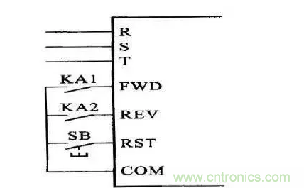 3、找到变频器的控制端子,在外面加装2个中间继电器,分别是KA1与KA2,接线方法如下图所示,KA1工作时,变频器正转,KA2工作时,变频器反转,SB是复位按钮,当有异常报警时,变频器会停机,此时按下RST,可以消除报警,然后再重新启动变频器。