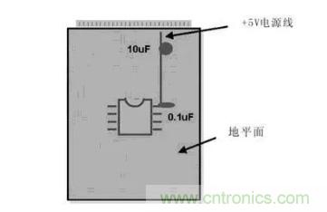 在布线时,模拟器件和数字器件都需要这些类型的电容,都需要靠近其电源引脚连接一个电容,此电容值通常为0.1uF。系统供电电源侧需要另一类电容,通常此电容值大约为10uF。