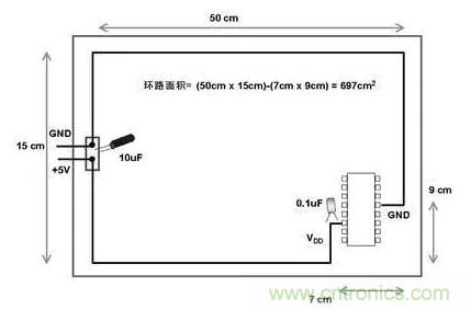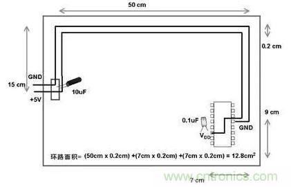 电源线和地线配合不当的PCB设计示例如图2所示,此电路板上,设计出的环路面积为697cm²。采用图3所示的方法,电路板上或电路板外的辐射噪声在环路中感应电压的可能性可大为降低。