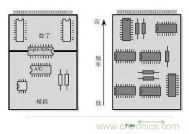 图4 (左)将数字开关动作和模拟电路隔离,将电路的数字和模拟部分分开。(右)要尽可能将高频和低频分开,高频元件要靠近电路板的接插件。