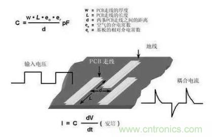 在这两种走线配置中,一条走线上电压随时间的变化(dV/dt)可能在另一条走线上产生电流。如果另一条走线是高阻抗的,电场产生的电流将转化为电压。