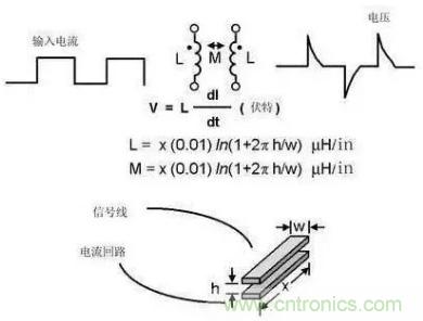 流经电路板走线的开关电流将引起电压发生变化,电路板走线存在寄生电感,可采用如下公式计算电压的变化:V = LdI/dt。其中:V = 电压的变化,L = 电路板走线感抗,dI = 流经走线的电流变化,dt =电流变化的时间。