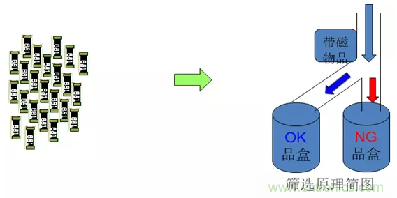 【原理】不良品的磁性小,吸引力小,进行筛选时会自动掉落到不良品盒,良品掉落到良品盒。