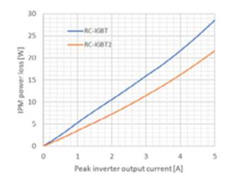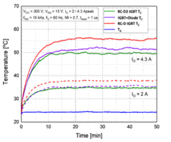 使用RC-D2的IM523 IPM在热性能方面优于其竞争对手。当输出电流为4.3A时,采用上一代RC-IGBT技术的IPM的外壳温度比IM523 IPM高出5°C。由于其开关性能更好,在相同条件下,IM523 IPM的外壳温度比使用单独的IGBT和二极管芯片的IPM低2°C。
