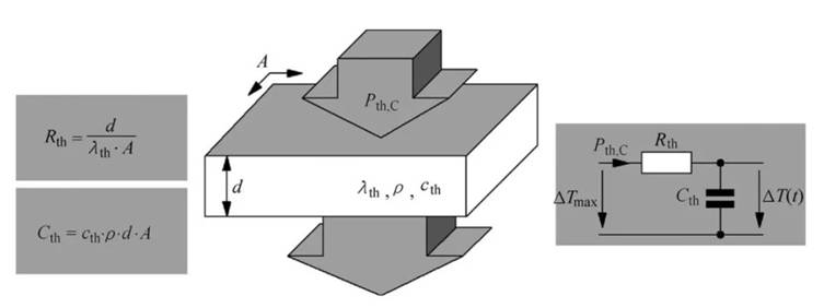 由于质量m=ρ·d·A(d是厚度,A是面积,ρ是密度),因此,可以利用材料的比热容cth、相对密度ρ和体积来计算电力电子器件的热容。