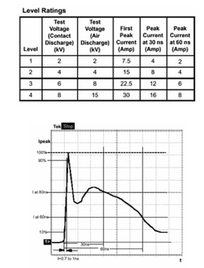 在系统级定义典型 ESD 事件的常用波形是 IEC61000-4-2 波形,其特点是亚纳秒上升时间和高电流水平(见图 1)。该波形的规格规定了 4 个级别的 ESD 幅度。大多数设计人员都需要将其产品鉴定为别,即 8kV 接触放电或 15kV 空气放电。在元件级进行测试时,接触放电测试是合适的测试,因为空气放电测试在如此小的元件上不可重复。