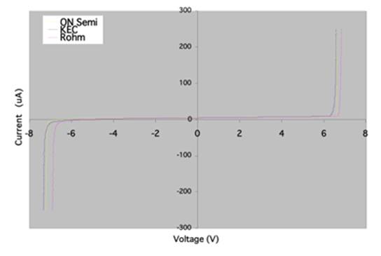 为了进行公平比较,所选部件应具有相似的封装尺寸和数据表规格。本次比较选择的部件是三个 ESD ?;ざ埽诒冉鲜荼碇械牡缙匦允?,这三个二极管被视为可以直接替代。这些器件均为双向 ESD ?;ざ?,具有相同的击穿电压 (6.8V)、电容 (15pf) 和封装外形 (1.0 mm x 0.6 mm x 0.4 mm)。本研究选择的产品是 Rohm 的 RSB6.8CS、KEC 的 PG05DBTFC 以及 ON Semiconductor 的 ESD9B5.0ST5G。