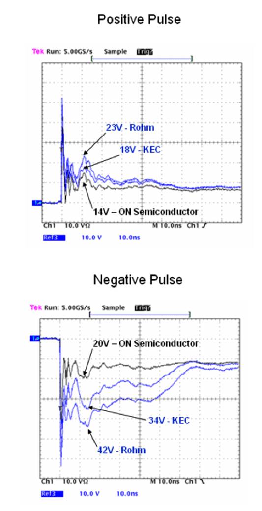 为了比较每个器件的钳位性能,我们将使用示波器截取 ESD 事件期间的电压波形。我们将进行并行测试,保持所有测试条件相同。下面的图 3 显示了同一图表上每个二极管对正负 ESD 脉冲的响应。使用的输入脉冲是标准 IEC61000-4-2 4 级触点 (8 kV)。