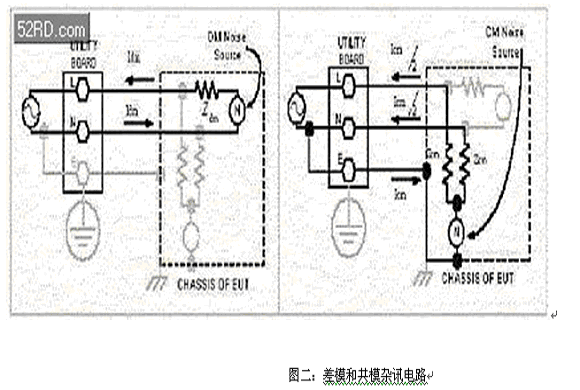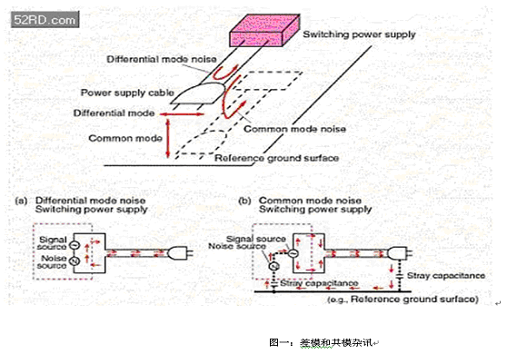 由EMI产生的杂讯也分成两类:差模杂讯和共模杂讯。简言之,差模杂讯是当两条电源供应线路的电流方向互为相反时发生的,如图1(a)所示。而共模杂讯是当所有的电源供应线路的电流方向相同时发生的,如图1(b)所示。一般而言,差模讯号通常是我们所要的,因为它能承载有用的资料或讯号;而共模讯号(杂讯)是我们不要的副作用或是差模电路的“副产品”,它正是EMC的最大难题。从图一中,可以清楚发现,共模杂讯的发生大多数是因为“杂散电容(stray capacitor)”的不当接地所造成的。这也是为何共模也称作“接地泄漏模式”的原因。