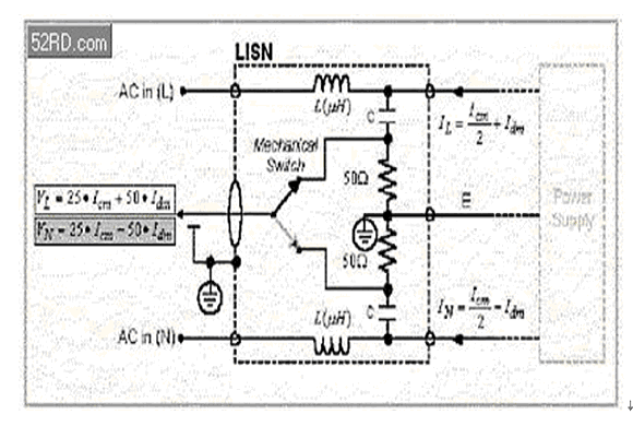 假设在此LISN电路中,L和C的值是这样决定的:电感L小到不会降低交流的电源电流(50/60Hz);但在期望的频率范围内(150 kHz to 30 MHz),它大到可以被视为“开路(open)”。电容C小到可以阻隔交流的电源电压;但在期望的频率范围内,它大到变成“短路(short)”。上面的叙述(几乎)是为真的。在图三中,主要的简化部分是,缆线或接收机的输入阻抗已经被包含进去了。将一条典型的同轴缆线连接到一台测量仪器(分析仪或接收机或示波器…等)时,对一个高频讯号而言,此缆线的输入阻抗是50欧姆(因为传输线效应)。所以,当接收机正在测量这个讯号时,假设在L和E之间,LISN使用一个“继电/切换(relay/switch)电路”,将实际的50欧姆电阻移往相反的配对线路上,也就是在N和E之间。如此就能使所有的线路在任何时候都能保持均衡,不管是测量VL或VN。
