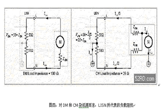 为了了解VL和VN,请参考图四。共模电压是25Ω乘以流向E的电流值(或者是50Ω乘以Icm/2)。差模电压是100Ω乘以差模电流。因此,LISN提供下列的负载阻抗给杂讯源(没有任何的输入滤波器存在):