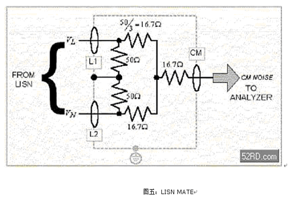 有一种装置称作“LISN MATE”,不过,目前已经很少被使用了。它会衰减DM杂讯约50dB,但不会大幅衰减CM杂讯(约仅衰减4dB)。它的电路如图五所示。