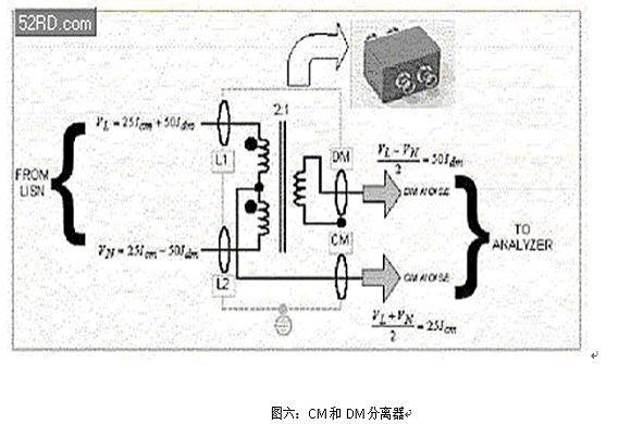 图六是一种以变压器为基础的装置,它是利用共模电压无法使变压器工作的原理;因为本质上需要差动的一次测电压,才能使变压器线圈内的磁通量“摆动(swing)”。它不像LISN MATE,此时CM和DM杂讯是一起输出。不过,上述的两种方法都需要修改LISN电路。因为一般的LISN只提供VL或VN,无法同时提供这两者。最好是购买CM和DM杂讯有分离输出的LISN。此外,也应该要有总和检视的功能,以确定是否有遵守技术规范的限制。