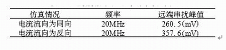 串扰是具有方向的,其波形是电流方向的函数,这里我们来看两种情况下的信号仿真。第一种情况是干扰源线网与被干扰对象线网的电流流向相同,第二种情况是干扰源线网与被干扰对象线网的电流流向相反(即位于B点的为驱动源,而位于A点的为负载)。AB和CD线网都加入20MHz的信号,表1给出了远端D点的串扰峰值,串扰的波形仿真结果如图4所示。