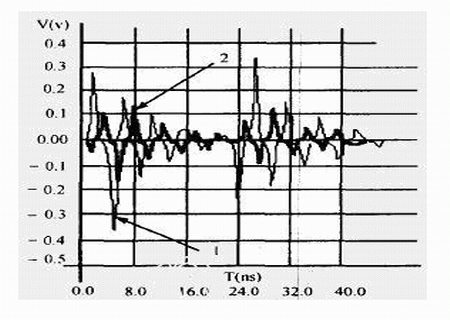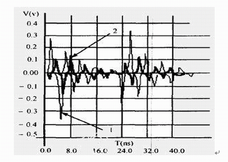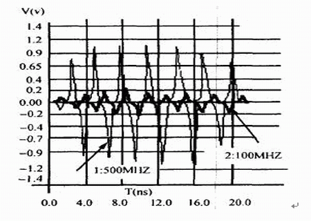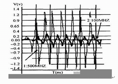 干扰源信号频率越高,被干扰对象上的串扰幅值越大,我们对图1中干扰源网络AB上的信号频率f1分别取不同频率值时,对被干扰对象上的串扰进行了仿真,仿真结果见表2,信号频率不同时的串扰波形见图5,标记为“1”、“2”箭头所指的波形频率分别为“500MHz”、“100MHz”。