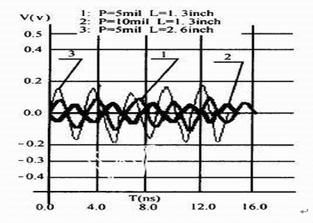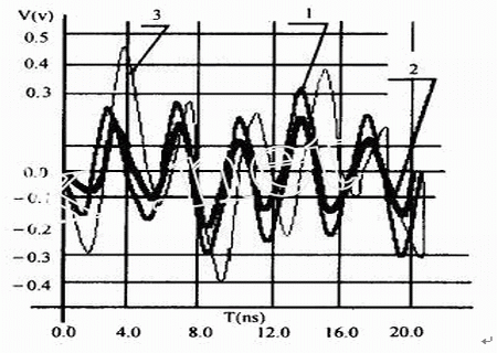 对于图1所示的两线系统,我们进行了三种情况的仿真(线网AB上的信号频率均为100MHz)仿真结果见表3,及图6.:第一种情况是在两线间距和平行长度不变的条件下,探测被干扰对象的串扰(标记“1”);第二种情况是在两线平行长度不变的前提下,将两线间距增加到10mils,然后探测被干扰对象的串扰标记“2”;第三种情况是在两线间距不变的条件下,将两线的平行长度增加到2.6inches标记“3”,然后探测被干扰对象的串扰。由仿真结果可见,当两线的间距拉大时(P由5mils变为10mils),串扰明显地减小了,而当两线的平行长度加长时(L由1.3inches变为2.6inches),串扰显著增大了。