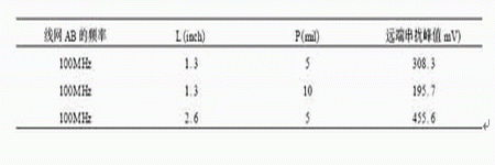 表3 两线间距P和平行长度L取不同值时的串扰峰值