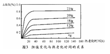 图3所示为卡玛线在不同拉力下绕制后,在190℃温度热老化过程中阻值随时间的变化曲线。拉力越大,阻值在热老化时的变化也越大,这说明热处理是消除应力影响的有效措施。