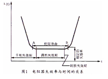 电阻器产品在正常条件下使用的失效可分为三种类型,即早期失效、偶然失效和耗损失效。图1所示是电阻器失效率与时间的关系曲线。从曲线上可看出三种失效的三个阶段。由于偶然失效出现在产品可靠工作的时期,研究这一时期的失效因素有重要意义。要提高产品的可靠性,必须加强产品对各种"应力"所能耐受的强度。这里所谓的"应力"是指对产品功能有影响的各种因素,如温度、电压电流、机械力等。