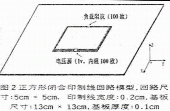 这是一种带有接地平面的正方形的闭合印制线环路,在回路的两端分别接有电压源和阻抗相等的源内阻、负载,当电压信号的频率较高时,这种结构与方环形天线是非常相似的,成为一种严重的辐射源。