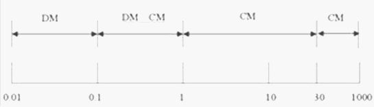 由于DC-DC转换器的工作频率基本都在几百KHz,根据以往各型号产品的EMC检测试验经验,一般情况下DC-DC转换器的EMI超标频段都会覆盖0.1_1MHz频段的一部分或全部范围。根据图1所示的分布原理,我们通常要采取有重点地对CM和DM同时抑制的原则。