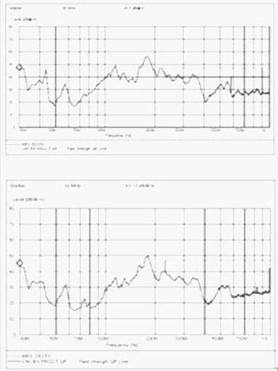 EMI辐射发射试验进一步验证开关管驱动缓冲电阻大小对整个DC-DC转换器EMI水平的影响。图2为转换器B采用非夹绕变压器时,当驱动电阻取值为1Ω和47Ω(反向并联有二极管)时的辐射干扰??梢钥闯鲈龃笄缱韬?,30MHz和接近200MHz的频点各有3_5dB的明显改善。