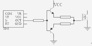 因此得出结论是,单靠提高开关速度来提高DC-DC转换器效率是不可取的。于是,如何选择合适的驱动电路参数、不断地优化驱动电路的设计,在提高DC-DC转换器的EMC性能的同时又保证总效率等其他参数指标不受到大的影响,是近年来发展的一个新方向。例如,在驱动电路中保留驱动电阻的同时加入推挽电路以代替二极管,这样就可以方便地分别调节控制开和关的速度,再权衡EMC性能和总效率指标的关系,以达到最理想的效果。如图3所示。
