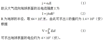 很多人都不清楚,地球也是一个带电体。根据实验测试,在地球表面存在一个垂直向下的稳定电场,电场强度E约为100伏/米,场强的大小随高度的增加而减弱。另外,根据实验测试,在地面附近大气的电导率σ0约为3×10-14西蒙/米,且随高度的增加而增加。由此可知地球表面的电流密度j的方向指向地心,大小为: