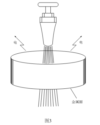 图3是一个让物体产生高压电的原理图,在水龙头的下面安放一个用金属薄片制作的圆圈(用金属罐头盒改制),金属圆圈必须要与周围绝缘,然后让水龙头流出的水正好从金属圆圈的中央穿过,金属圆圈很快就会带电,并且电压非常高,一般可达一万伏以上。用试电笔做试验时,当试电笔离金属圆圈还很远的地方,就可以看到试电笔被点亮,甚至拿一个小荧光灯靠近,也可以看得到荧光灯微亮。这说明电压非常高,但对人体不存在被触电的危险,因为金属圆圈的电容量很小,存储的能量有限。