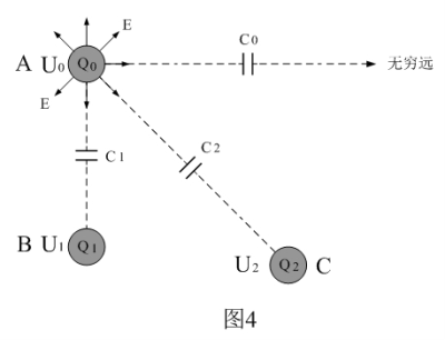 图4是带电物体对其它物体产生感应的原理图。图4中,A是带电物体,其电位为U0,E表示电场强度或电场力线,Q0为其带电量;带电物体A对物体B和物体C均会产生电场感应,U1和U2分别为物体B和物体C被物体A感应产生的对地电位;Q1和Q2分别为物体B和物体C被物体A感应产生的电荷量。带电物体A的电荷Q0越多,其电位U0就越高,并且其对物体B或物体C产生感应影响的力度就越大。