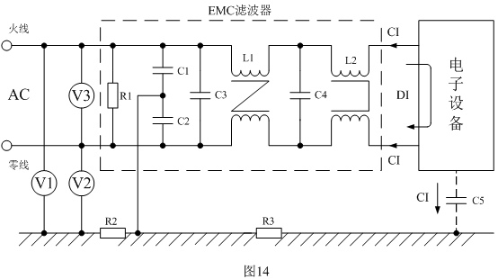 图14是根据上面分析而设计的EMC(电磁兼容)滤波电路,EMC滤波电路如虚线框内所示。