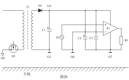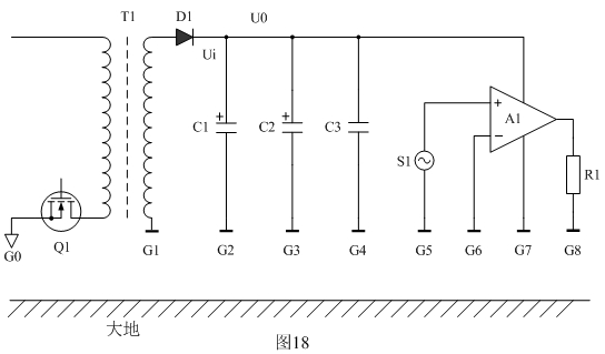 下面我们以图18为例来分析地线对EMC产生的影响。图18中Q1表示开关电源,T1为开关变压器,D1为整流二极管,C1、C2、C3为滤波电容器,A1为功率放大器,S1为功率放大器输入信号,R1为功率放大器输出负载,G1、G2、G3、G4、G5、G6、G7、G8为各个器件的地;Ui表示整流输出电压,Uo表示经过滤波后的输出电压。